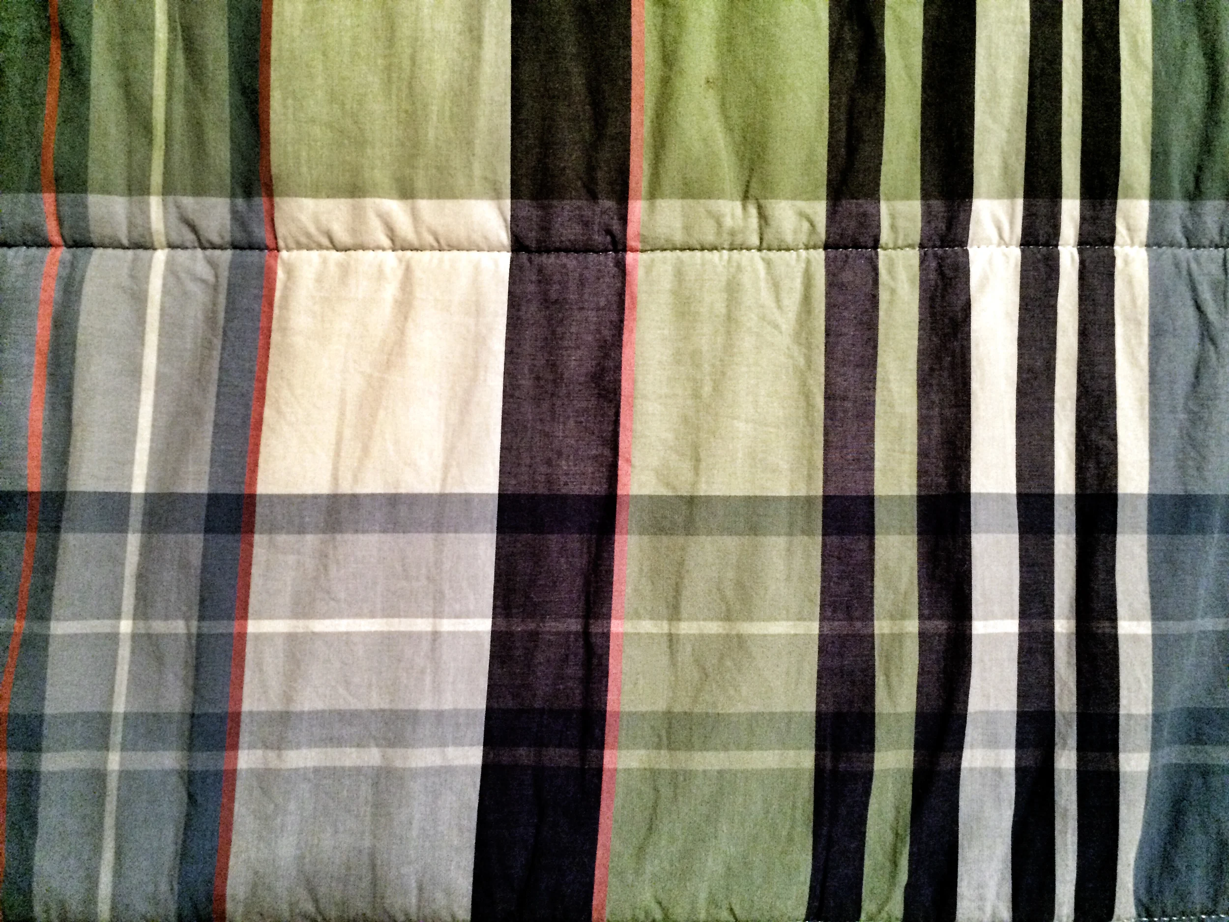 A photo of a bedspread. The patterns of various lines and boxes intrigued me. I used a little bit of Photoshop to boost the contrast.